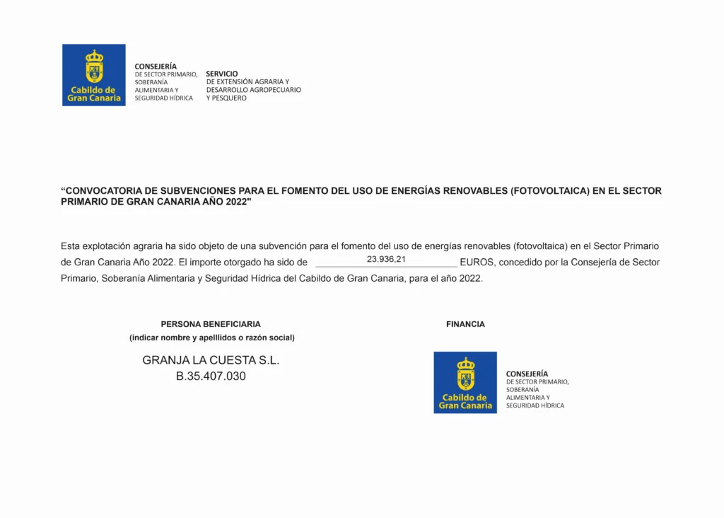 En Granja La Cuesta, estamos profundamente agradecidos por el apoyo recibido a través de las subvenciones públicas que contribuyen al crecimiento y mejora de nuestra actividad. Estas ayudas nos permiten avanzar en proyectos clave, como la sostenibilidad de nuestras prácticas, la modernización de nuestras instalaciones y la promoción de productos de calidad para la comunidad canaria